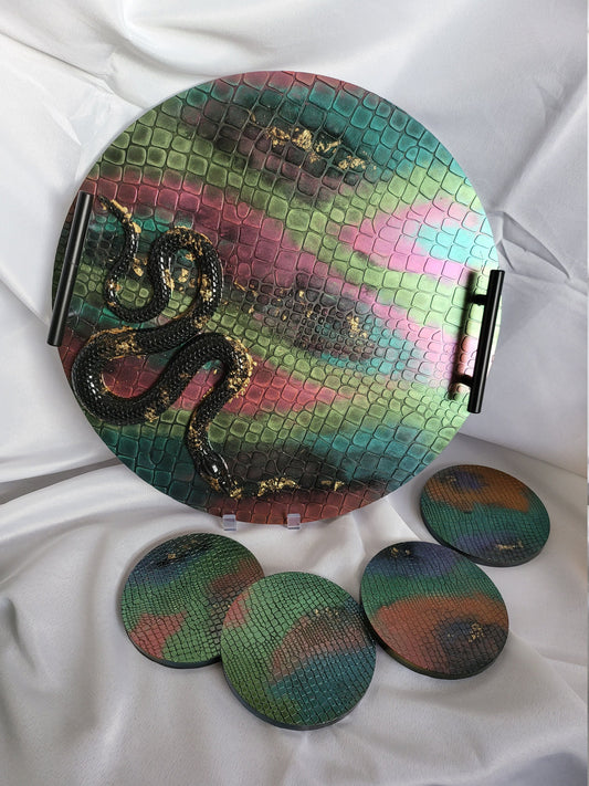 Round reptile tray with coasters. Snake accent and reptile print wit handles . Serpent accent décor. Witchcraft spell tray