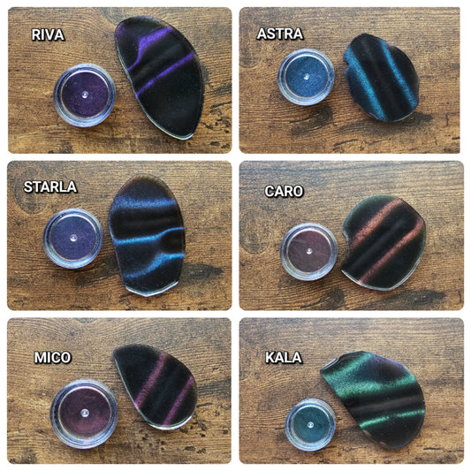 Shapeshifter pigments. Cat Eye magnetic powder. Great arts, crafts, nail polish mix. Magnet required for desired effect. 1 gram jar
