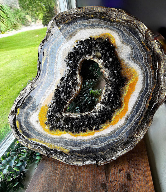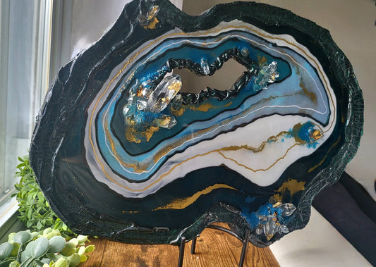 Resin wallart with geodes and crystals. Freeform geode with shimmering effect painting. Genuine pyrates and quartz crystals.