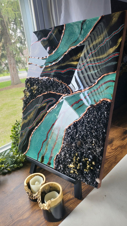 Resin wallart with geodes and crystals. Resin contemporary geode shimmering effect painting. 11"×14"